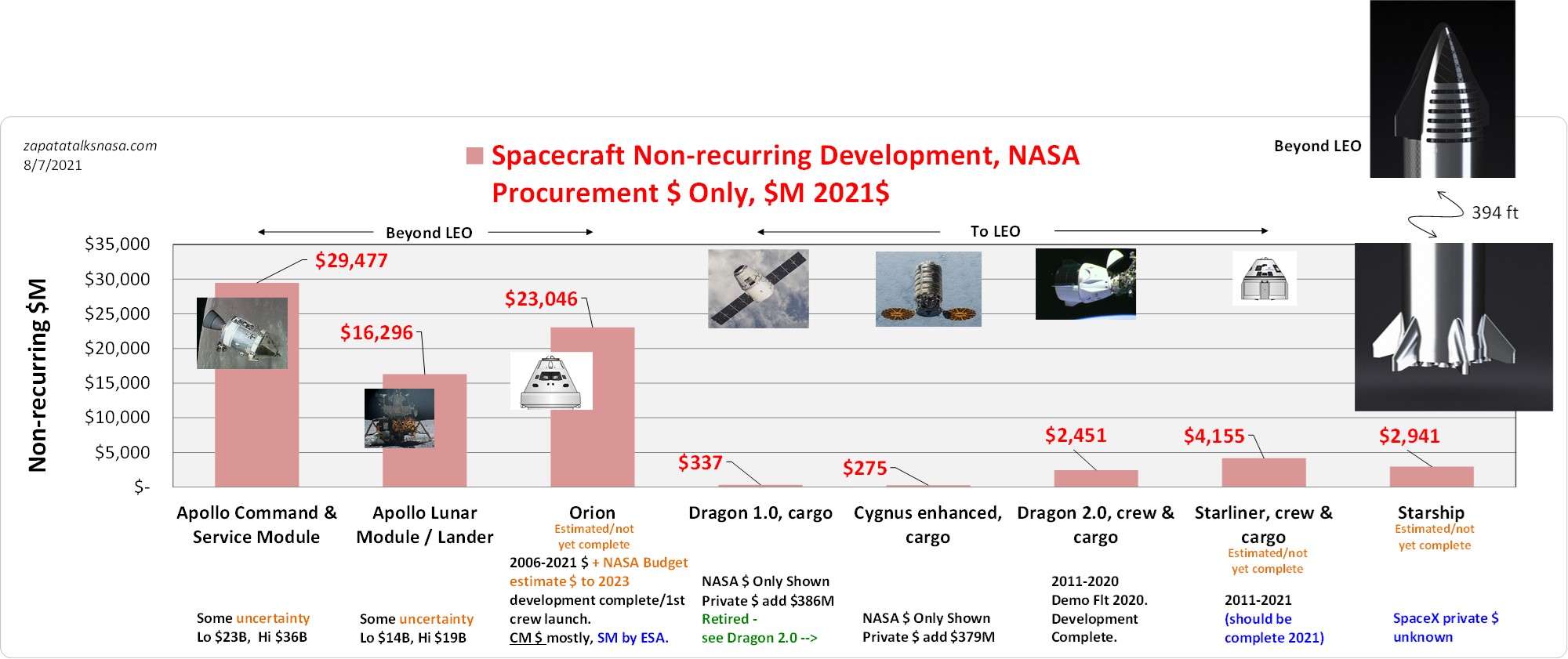 The up-front cost of US spacecraft for cargo and crew, “cost-plus” (Apollo, Orion), and as partnerships/commercial (the rest). Credit: Edgar Zapata, zapatatalksnasa.com