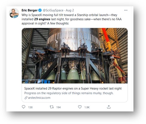 So, it was a pleasant surprise to wake up one day and see the SpaceX team installed twenty-nine engines – in one night. Twenty-nine. Someone will inevitably say these are slightly smaller engines than the Shuttle’s, but not by much. In NASA-speak, the Shuttle engines were just the start of what we called our “plumber’s nightmare,” from the Shuttle orbiter all the way up and through to the orange external tank and out to the endless facilities. And that was just three engines. What the plumbing must be for twenty-nine engines on a Starship boggles the mind, mine at least.