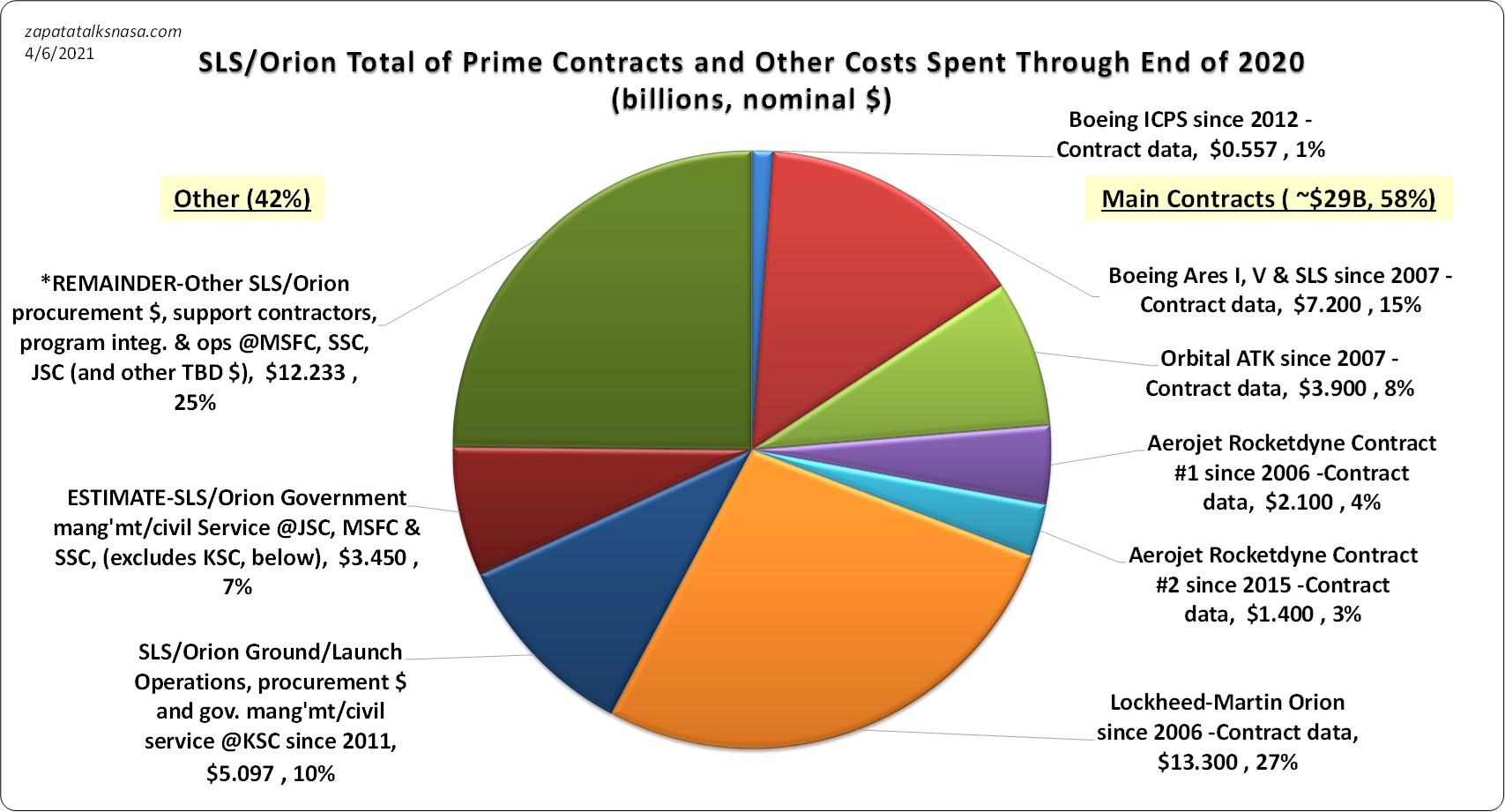 Of course, the totals will be high – they come from adding up huge budgets year after year. That is unless you believe – that is not what that reeealy costs. Why not even just the big awards are what that project reeealy costs. All of this is about the infamous notion – first seen in the wild in the mid-1990s, whereby the Space Shuttle really cost very little because if it did not exist, NASA would still pay to hold on to and keep everything else. (My Department of Defense brethren said the way NASA accounted for dollars was ripe for making projects an easy target of criticism. They gave themselves credit for having figured out how to turn large numbers into endless smaller numbers. Divide and you won’t be conquered.)