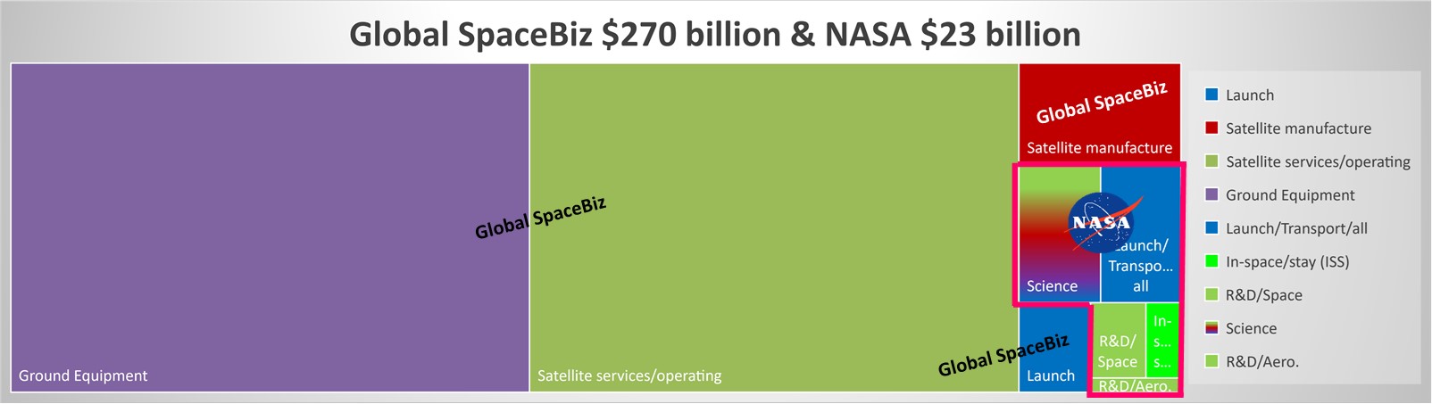 After a specific scale, our intuition fails us. Whatever is so much larger, farther, or faster than our day-to-day experience is quickly incomprehensible. This is so for the scale of NASA. As if degrees of the unimaginable are possible, the scale of the global space economy beyond NASA is larger by over a factor of ten. What of the scale when we hear about the growth of the worldwide space economy to a trillion dollars?