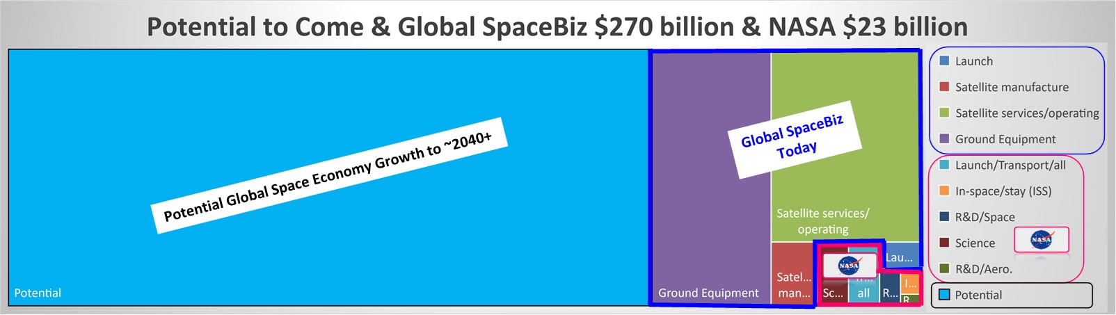 With that in mind, I graphed NASA, the current global space sector, and the potential trillion-dollar space sector to come. Above, in the lower-left outlined in bright red, is NASA. Yes, that little acreage is all of NASA’s yearly budget. The bright blue outline of all the rest of the neighborhood is the current yearly global space economy, according to one data source. (Other sources put the number higher, well above $300 billion a year.) Lastly, the “potential” acreage is all the blue sky ahead, 2040 or so really not that far away.
