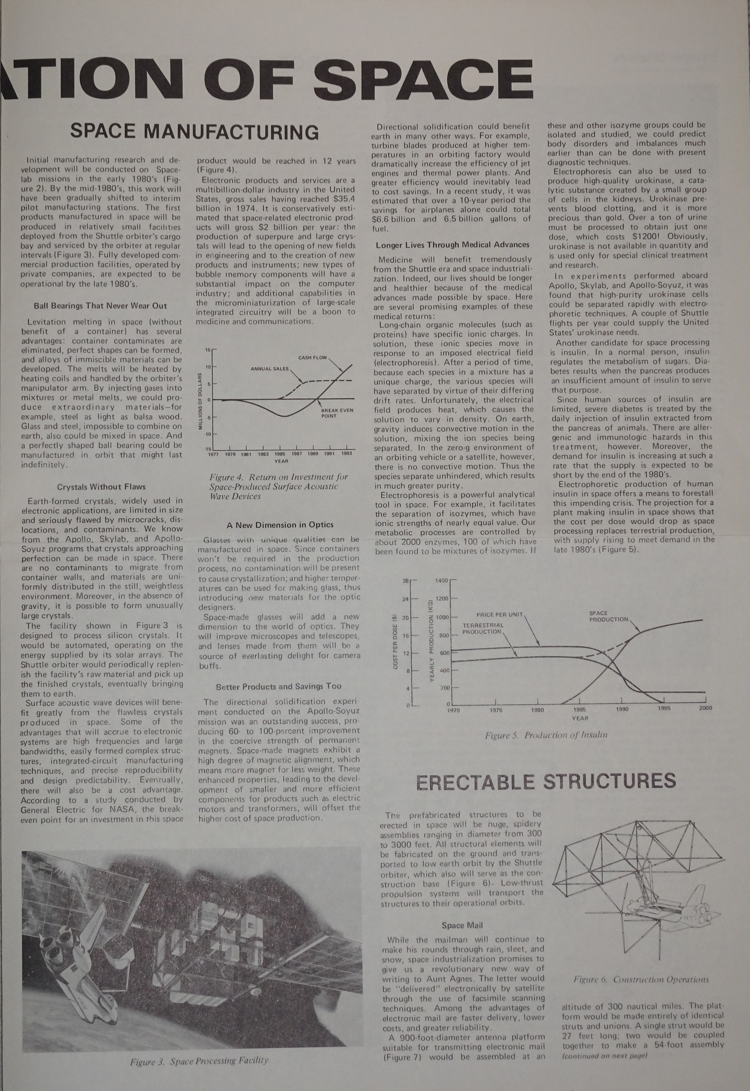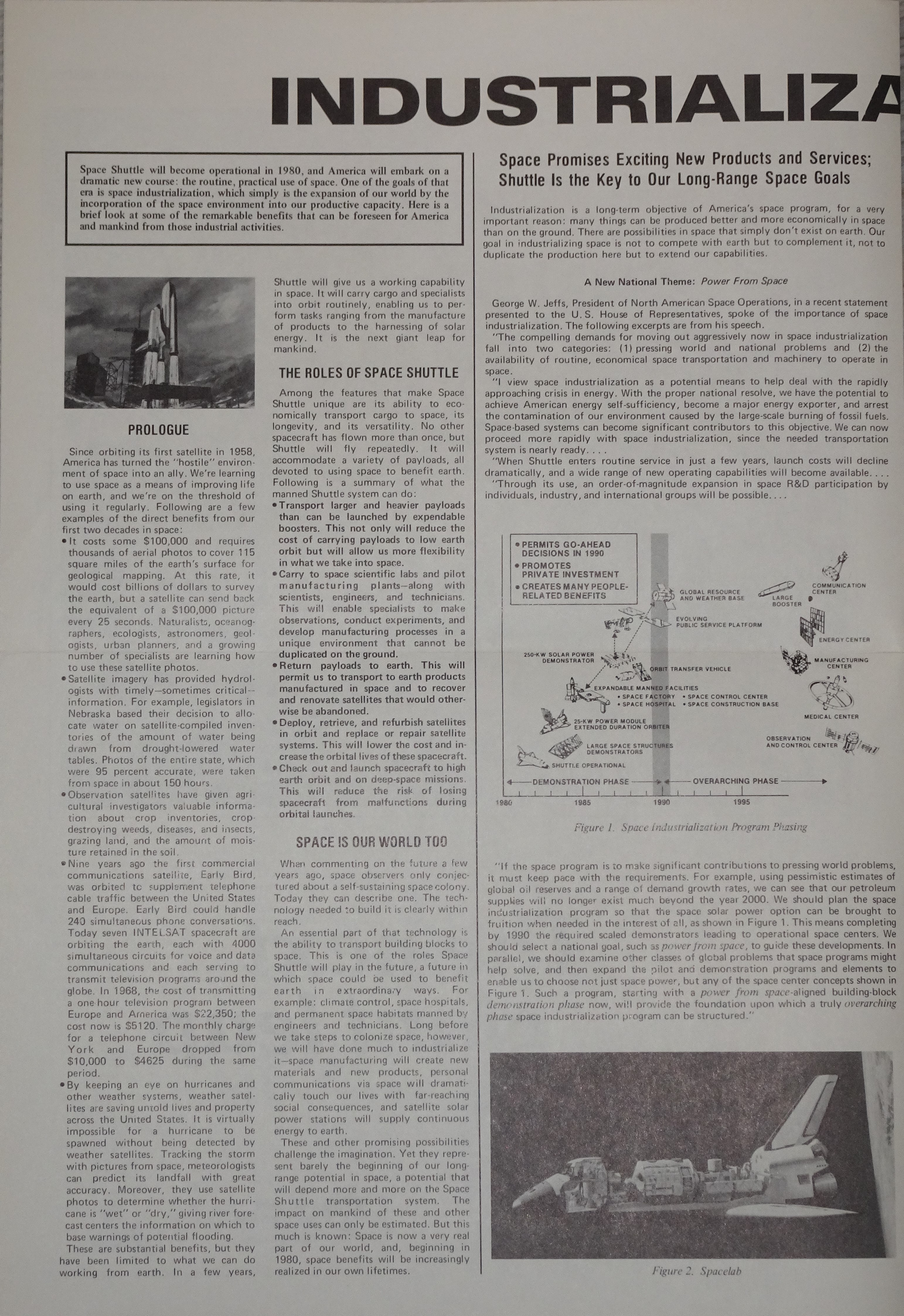 Space Shuttle will become operational in 1980, and America will embark on a dramatic new course: the routine, practical use of space, One of the goals of that era is space industrialization, which simply is the expansion of our world by the incorporation of the space environment into our productive capacity. Here is a brief look at some of the remarkable benefits that can be foreseen for America and mankind from those industrial activities.