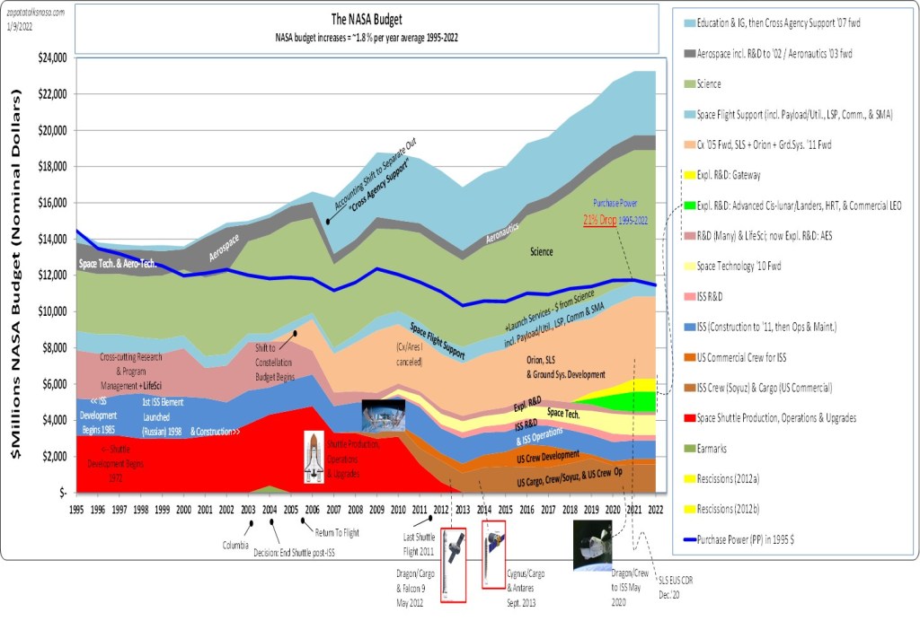 All the while, NASA’s budget has seemingly shot up like a rocket. But take the red pill, get your location, and it has actually gone down. Inflation really is a thing, after all. Yet even this view is generous. There are holes aplenty in assuming the cost of a constant set of NASA-ish aerospace goods, parts, services, research, and technology have gone up over time only as little as the official NASA inflation index says. Nonetheless, even using the (optimistic) official NASA inflation index, NASA’s purchase power has declined by about a fifth since 1995 (actually 21%, to be accurate.)