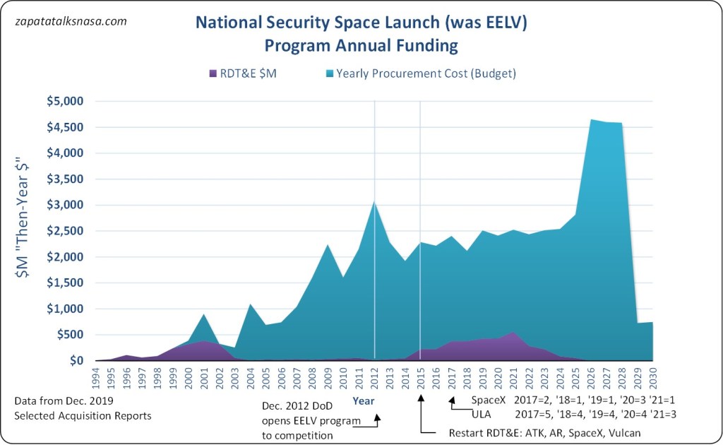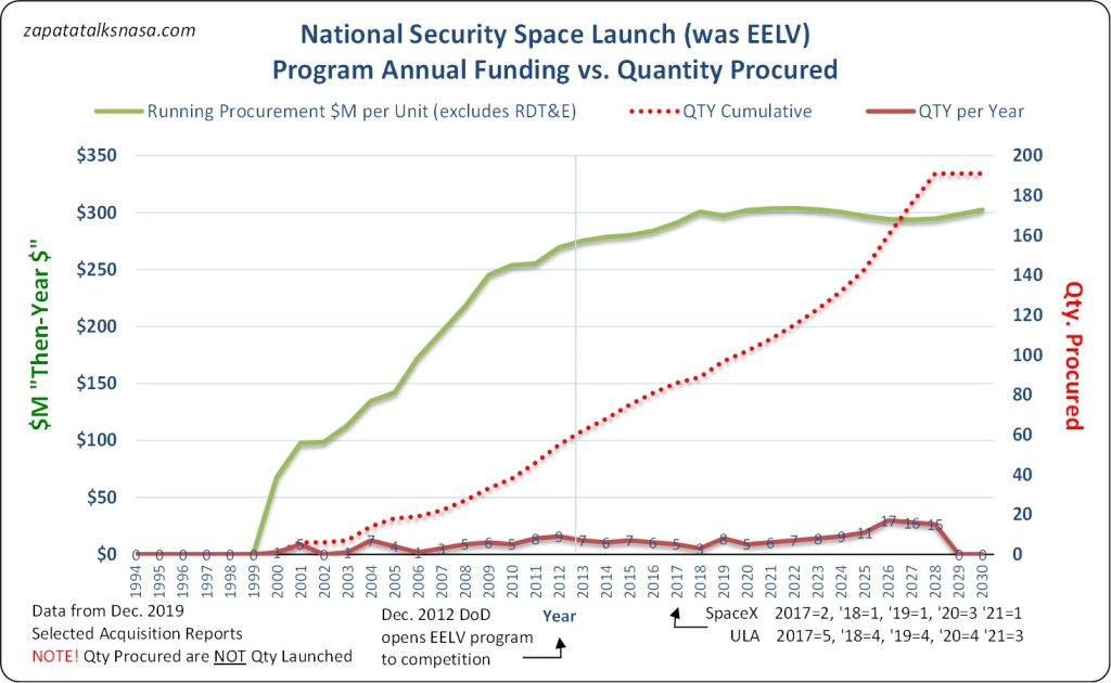 Shown are a couple of views on the National Security Space Launch program as of a valuable report from December 2019 entitled “Selected Acquisition Reports.” This report is a high-level summary, to an analyst anyway. It shows funds and such across time, helping with the questions – has the cost of launch to the US DOD dropped in recent years? Where is the SpaceX effect?