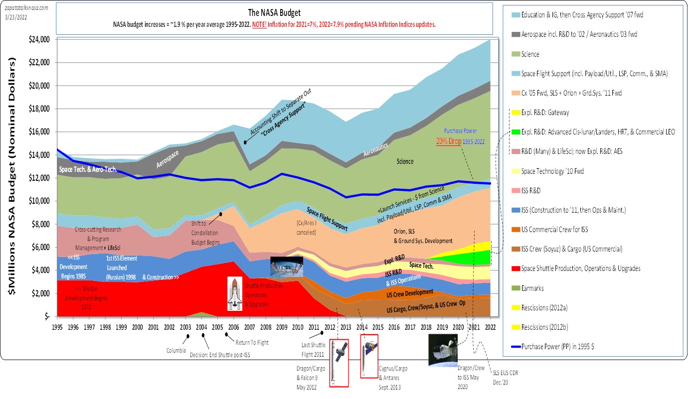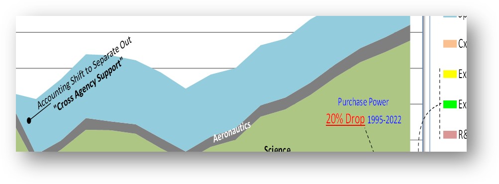 Viewed over time, though, that laundry list of NASA’s overhead (or “support”) costs across the country and its projects was 21% ten years ago. Not that anyone wanted to step up and say that NASA needed to spend more on support. Naturally, overhead was told to make do with the same money year after year, dropping as a percentage as the NASA budget increased. The opposite happened for NASA programs opting to go commercial, which stood at only 9% of NASA spending ten years ago. While it’s tempting to wonder if NASA shifted overhead into commercial space hardware, the actual flow of money is likely very different. Albeit a dollar being a dollar, anyone pondering the fungibility of it all is asking a good question.