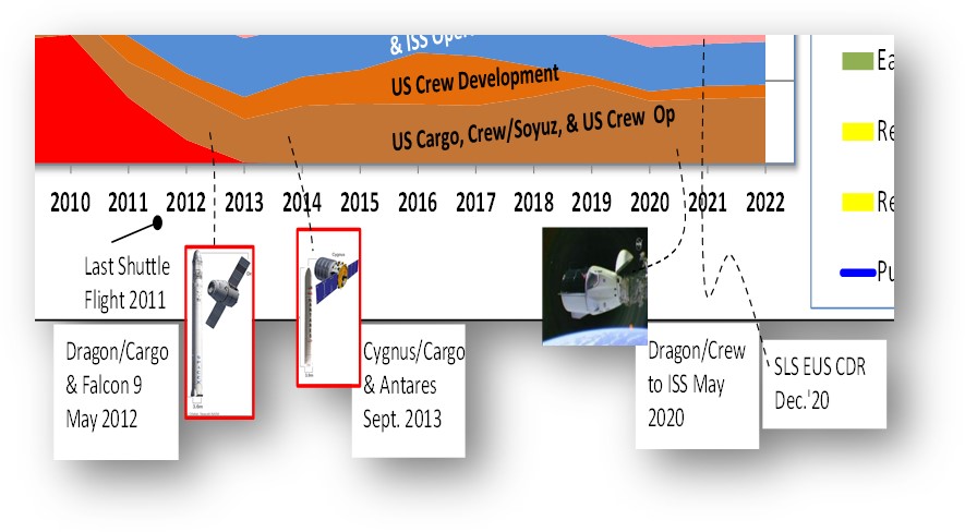 By the numbers, in 2022, about 16% of NASA dollars will be spent on its commercial programs. A commercial program typically involves the government contracting with more than one provider focusing on a milestone, a result, or a service, at a firm fixed price. What else is there? Wouldn’t anyone spending this much money always have lined up some competitors to assure there is a backup? Wouldn’t the price always have been agreed to up-front? Wouldn’t the payment always have been withheld until delivery? No, no, and no. On the contrary, such commercial arrangements were rare for NASA until taking this route for getting cargo to the International Space Station, knowing the Space Shuttle’s days would soon be over.