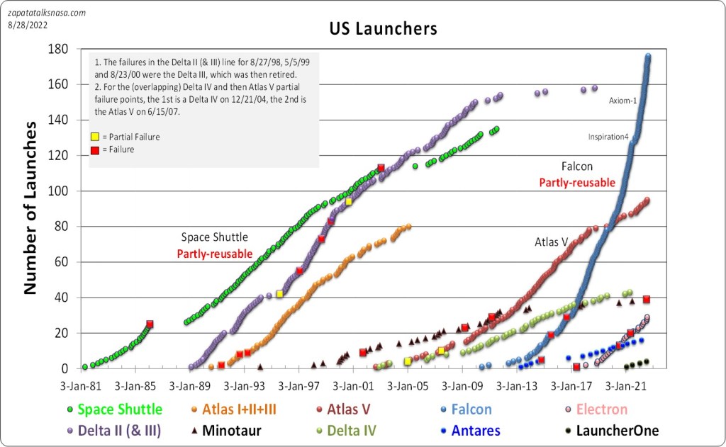 As we continue to move to the left, the United Launch Alliance (Boeing and Lockheed) Atlas V started to sputter as well, around 2017, with a low launch cadence since. This brings us to Falcon 9, with data points so close together as to draw a near-solid line. In 2022, SpaceX is running a yearly launch rate of about 59 launches a year. For SpaceX, gone are the days when you could see individual launches in the lines connecting the dots.