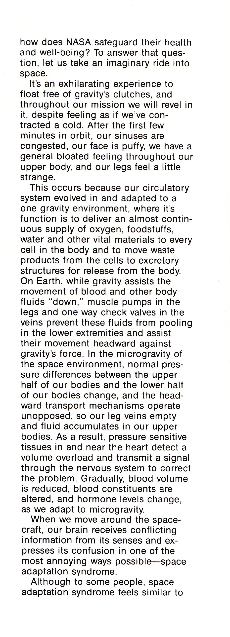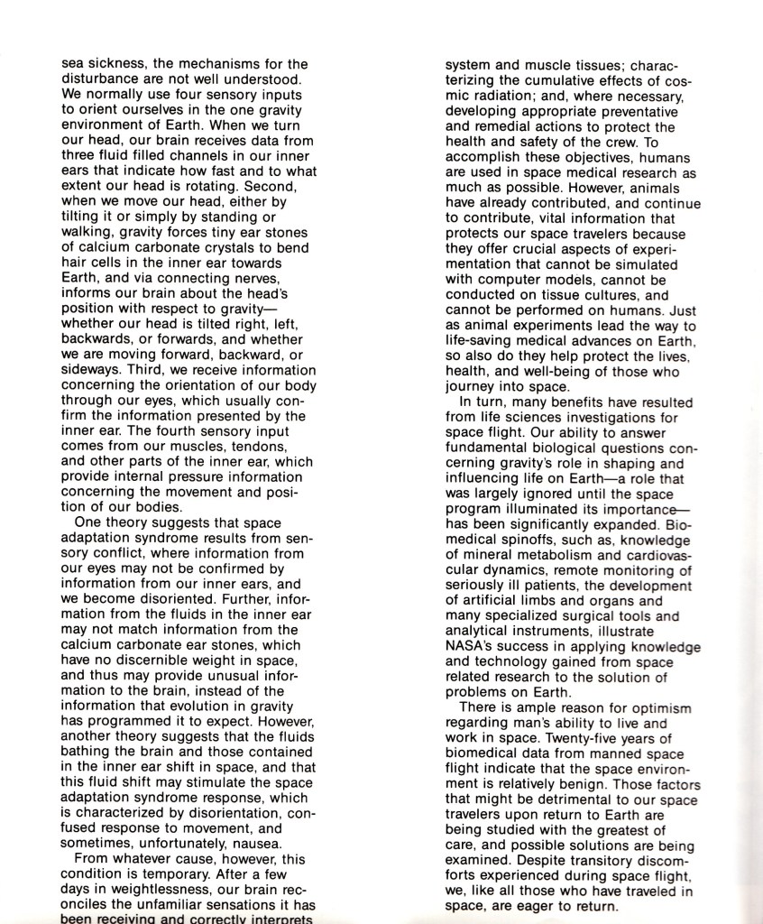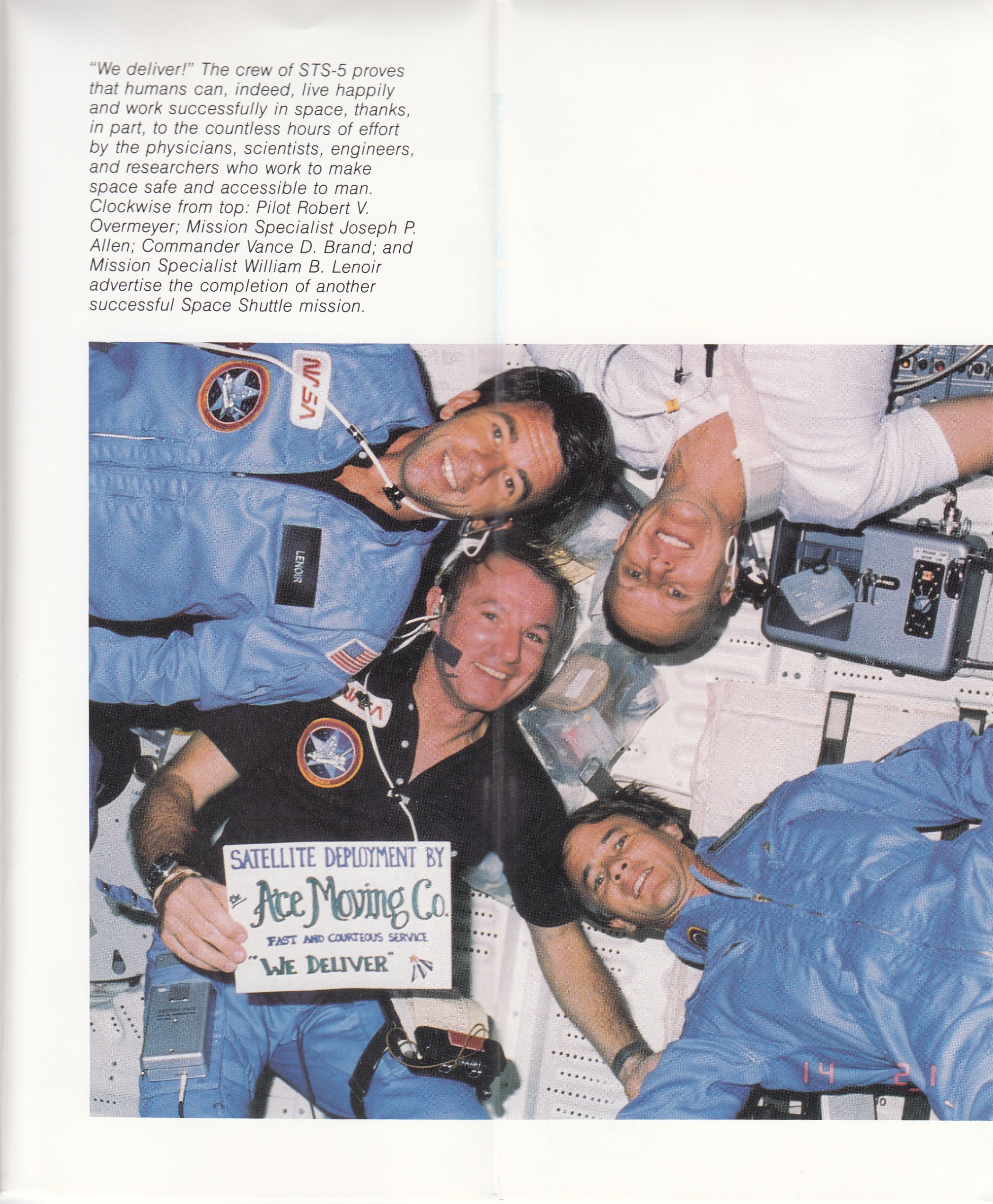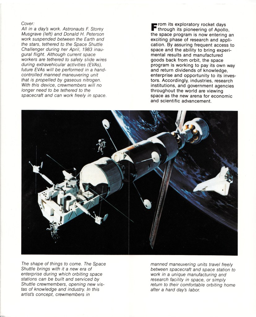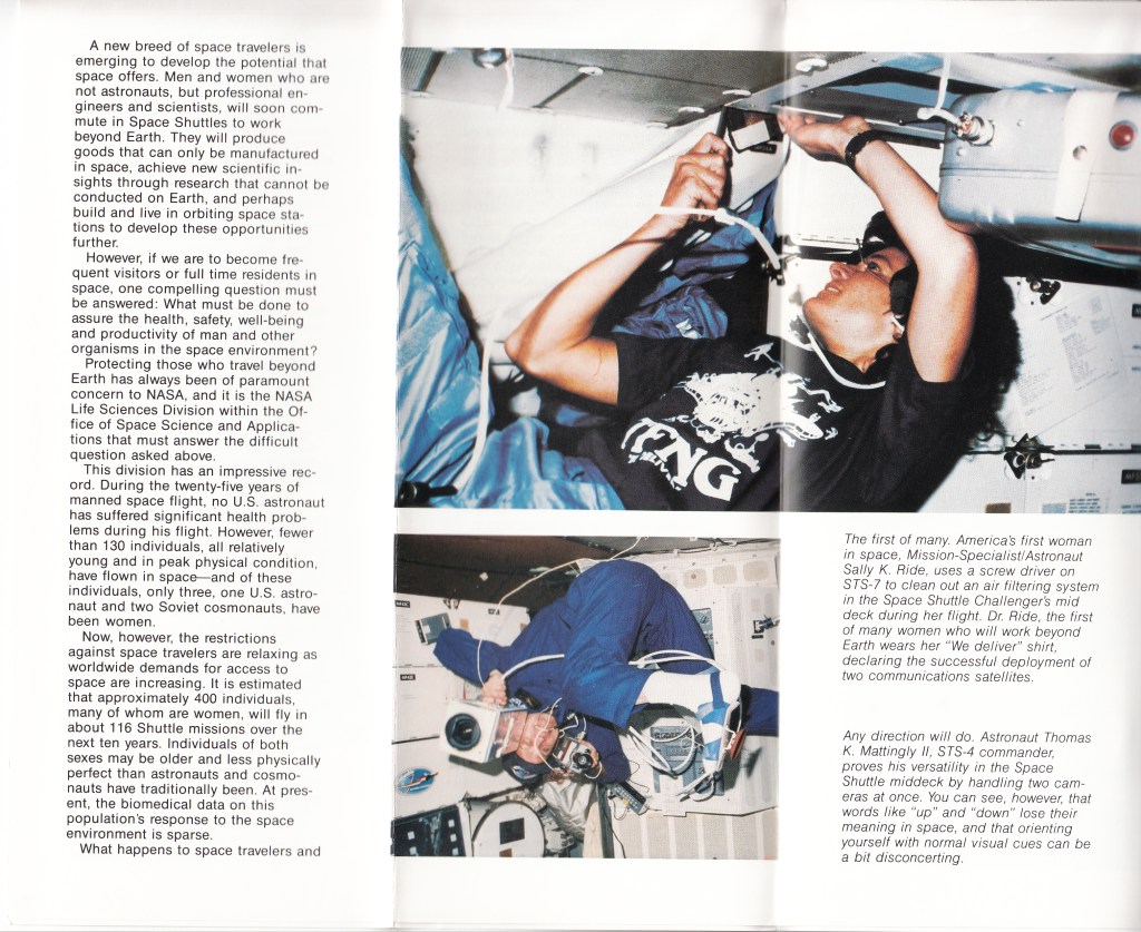 Front cover of the folded NASA pamphlet “Living and Working in Space,” from 1983.The NASA pamphlet, “Living and Working in Space,” from 1983. The Space Shuttle did complete the construction of the International Space Station in 2011.The NASA pamphlet, “Living and Working in Space,” from 1983. “Now, however, the restrictions against space travelers are relaxing as worldwide demands for access to space are increasing.” These words might have been written yesterday as well! Top picture, Astronaut Sally K. Ride. Bottom picture, Astronaut Thomas K Mattingly. Text continues below.The NASA pamphlet, “Living and Working in Space,” from 1983. Text continues below.The NASA pamphlet, “Living and Working in Space,” from 1983. Text continues below.The NASA pamphlet, “Living and Working in Space,” from 1983.The NASA pamphlet, “Living and Working in Space,” from 1983.The NASA pamphlet, “Living and Working in Space,” from 1983. “We deliver!” The crew of space shuttle mission STS-5.The NASA pamphlet, flip-side once folded, “Living and Working in Space,” from 1983.