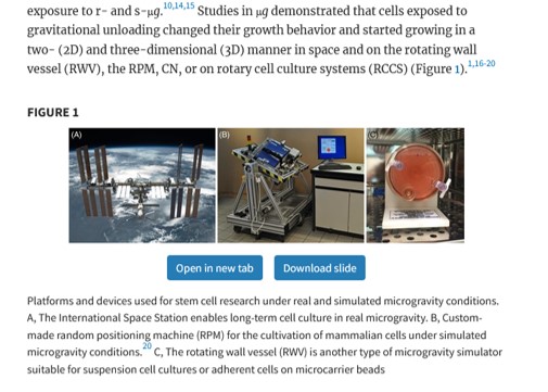 - 2016 Why are scientists shooting stem cells into space? Studies aboard the International Space Station probe astronaut health and regenerative medicine. This is one of the earliest pop-articles on stem cell research on the ISS, here for cardiac progenitor cells. “But he estimates it will take 100 million to 200 million such cells to treat a human, and they are difficult and time-consuming to grow. Based on earlier evidence that stem cells proliferate happily in microgravity, Zubair plans to test whether a trip to space will coax his MSC populations to expand. If so, his research will tackle an ever bigger question: Can sterile, clinical-grade cells be grown in the orbiting lab? And after their space odyssey, would they still be safe to inject into people?”
