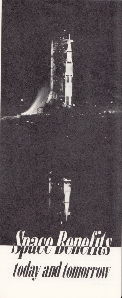 This quad-fold pamphlet “Space Benefits – today and tomorrow” is from 1971. I am not sure who gave me this one, but I do remember the slew of retirements as the Apollo generation left in the late 1990s. Always, the cabinets chock-full of paperwork remained. These came with a passing comment on the way out – “I’m leaving that all there, in case anyone wants it.”