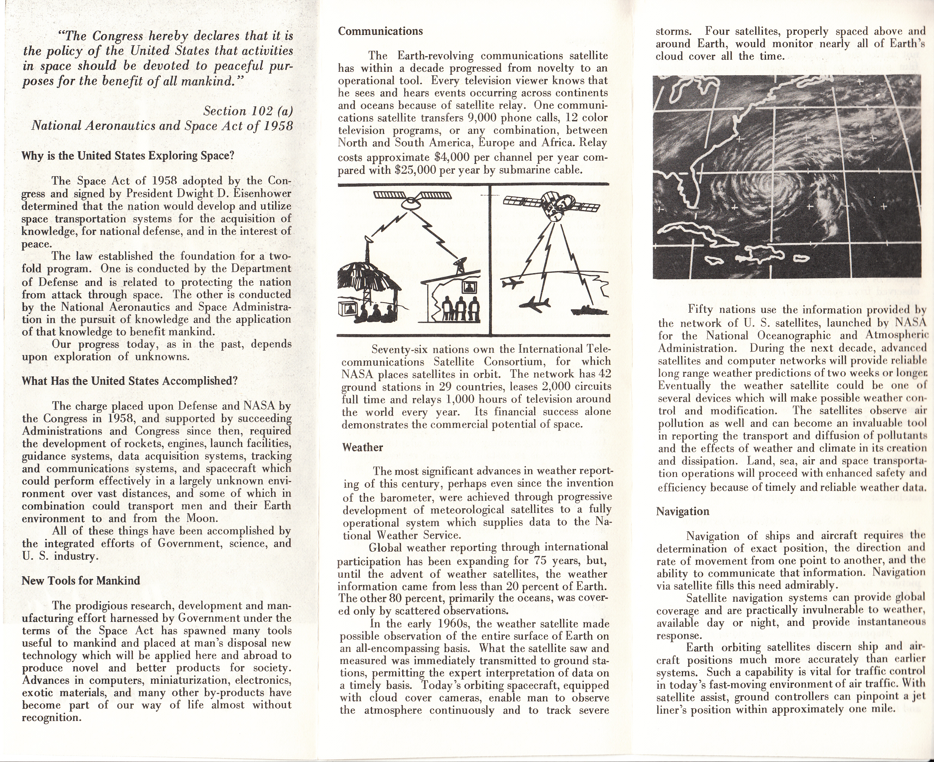 Front cover of the quad-fold NASA pamphlet “Space Benefits – today and tomorrow,” from 1971.The benefits of research and development of space and space systems include advances in communications, going from “novelty to an operational tool,” weather reporting, where “the satellites observe air pollution as well,” navigation of ships and aircraft, (before the arrival of GPS satellites), and agriculture, including “advance warning of drought.”Continued from above, quad-fold NASA pamphlet “Space Benefits – today and tomorrow,” from 1971.Flip-side of quad-fold NASA pamphlet “Space Benefits – today and tomorrow,” from 1971. The benefits of research and development of space and space systems for astronomy, Earth resource management, oceanography, and more. Bonuses include a better “smoking pipe!” More ahead of its time in seeing what benefits were ahead, “Computer programming has been adapted to such diverse uses as an instant flight and reservations system for airlines and the rapid handling of stock market transactions.” Note the lower right – NASA/PAFB (Patrick Air Force Base) 1971.