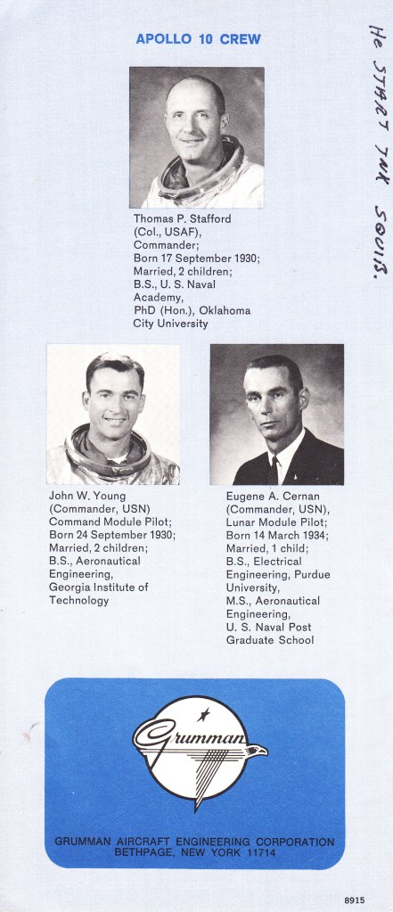 As a launch approached, this quad-fold pamphlet “Apollo 10 The Lunar Module in Lunar Orbit” was likely part of a “press kit” given to employees, the public, and the press. This would date the pamphlet to 1969, as Apollo 10 lifted off on May 18, 1969. The most memorable aspect of the mission is the crew came so close but did not land on the Moon. As NASA again looks to the Moon, this Apollo 10 shakedown of everything, minus landing, can add to the conversation.