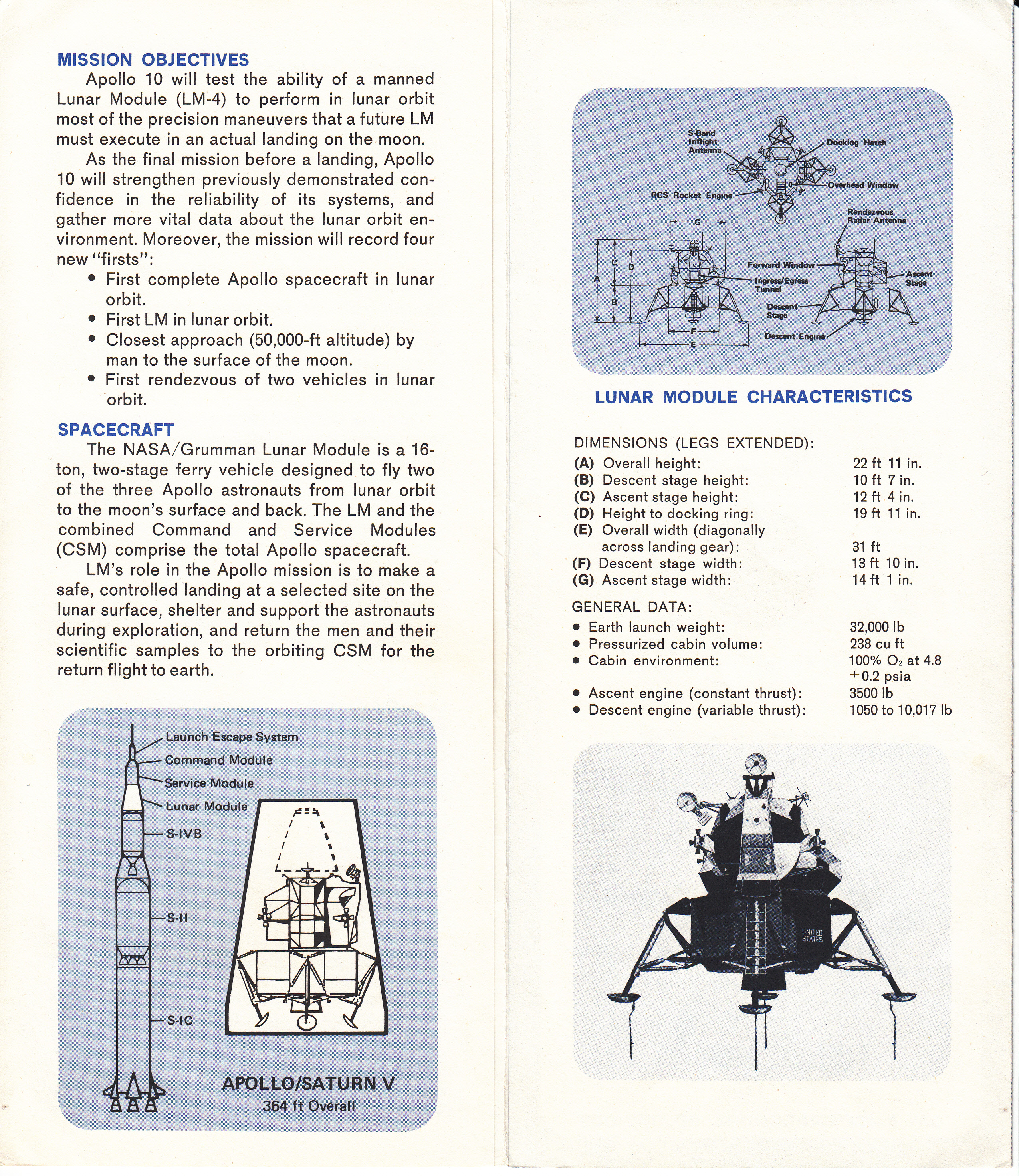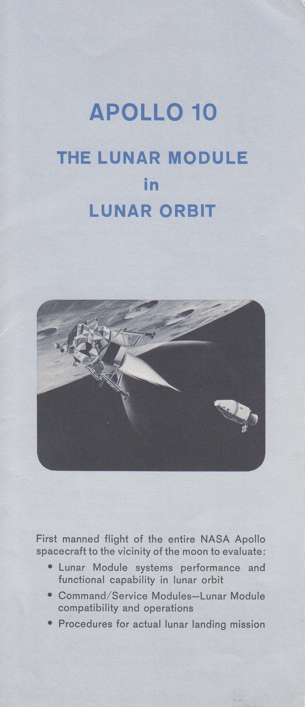 As a launch approached, this quad-fold pamphlet “Apollo 10 The Lunar Module in Lunar Orbit” was likely part of a “press kit” given to employees, the public, and the press. This would date the pamphlet to 1969, as Apollo 10 lifted off on May 18, 1969. The most memorable aspect of the mission is the crew came so close but did not land on the Moon. As NASA again looks to the Moon, this Apollo 10 shakedown of everything, minus landing, can add to the conversation.