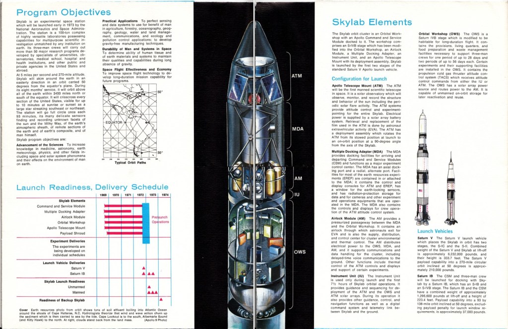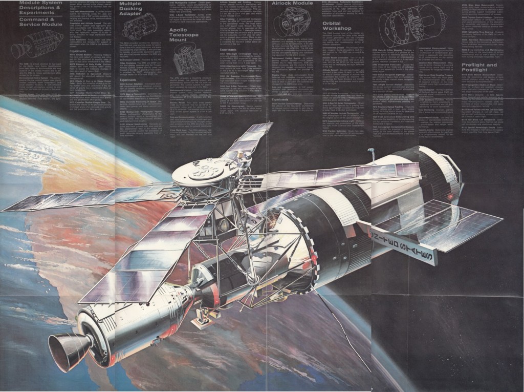 This fold-out poster pamphlet “Skylab,” by Martin Marietta, is an infographic from before infographics were an online newsy-site thing. It’s amazing the capability you could outfit for about 75 tons (not including the Apollo spacecraft for the crew, launched soon after).