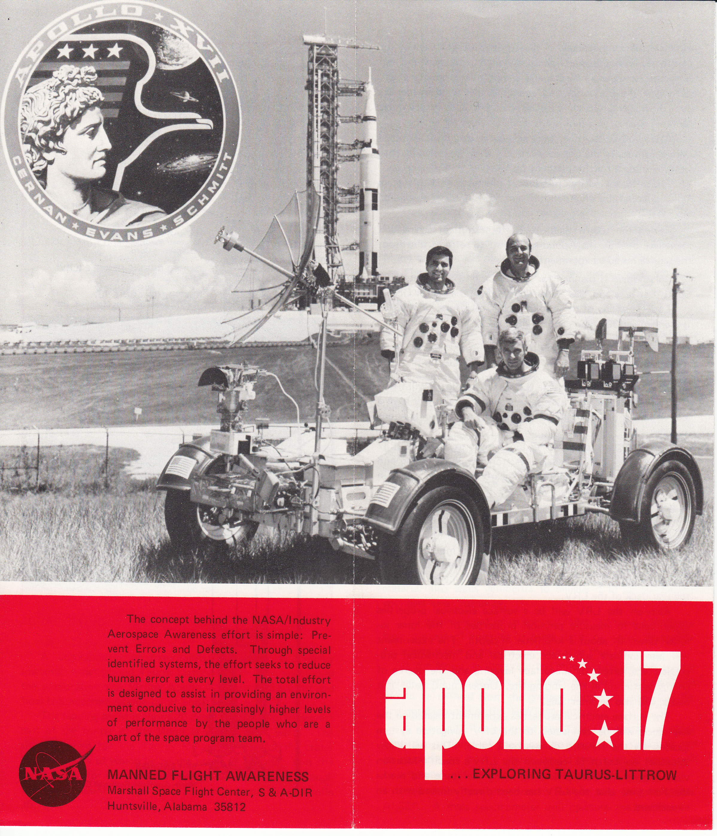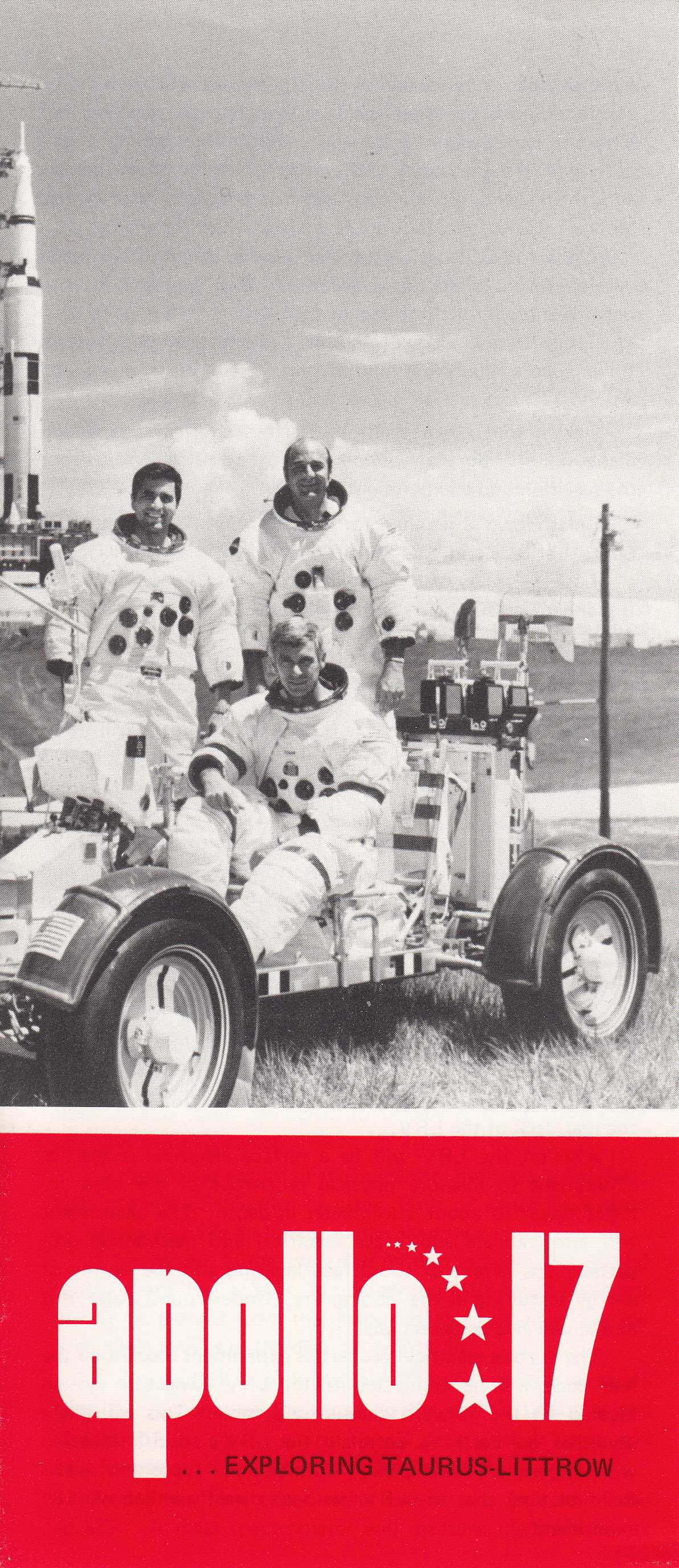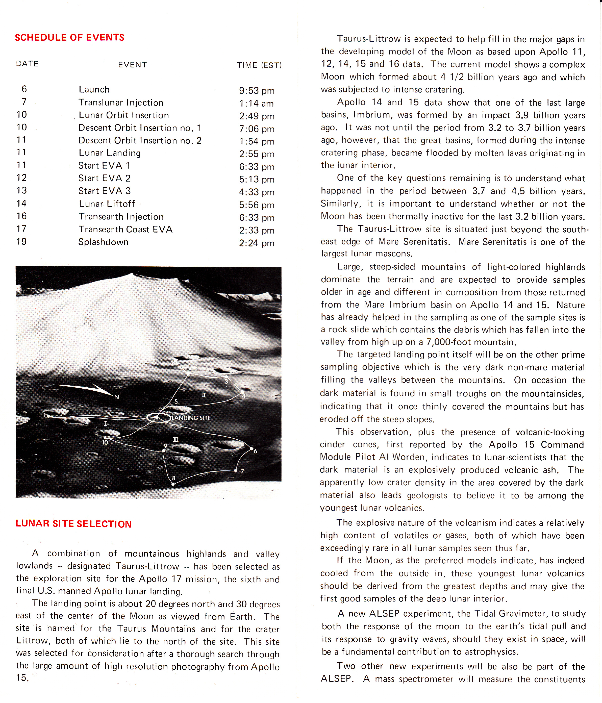 Cover, 1972 NASA pamphlet, “Apollo 17”Opening pages of the 1972 NASA pamphlet, “Apollo 17”Middle pages of the 1972 NASA pamphlet, “Apollo 17”.“Taurus-Littrow is expected to help fill in the major gaps in the developing model.of the Moon as based upon Apollo 11, 12, 14, 15 and 16 data. The current model shows a complex Moon which formed about 4 1/2 billion years ago and which was subjected to intense cratering.”