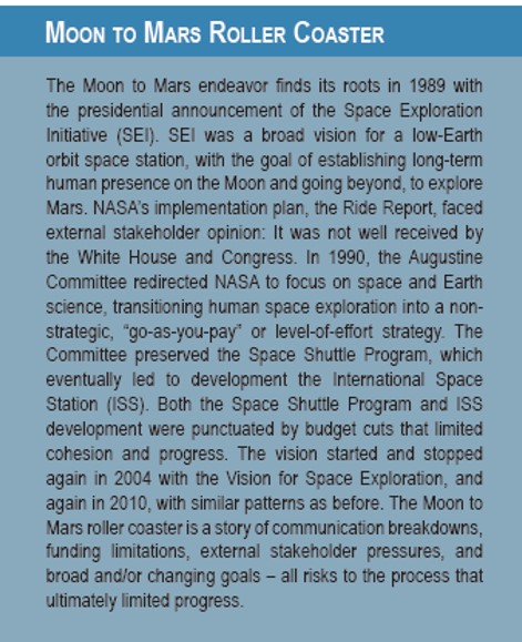 A typical NASA strategy document (or its kin, plans, and implementation) arrived in a lovely, glossy brochure. The heavy-weight, quality paper smelled new, exuding promise. The content did not much change as these became electronic documents never to see the light of the US Government Printing Office. The electronic versions read like their decorative coffee table book ancestors. The upper portion of each two pages was a picture of an astronaut as she floats weightlessly aboard the Shuttle. Below, the two-column format in a business font went on about the wonders of space. Page after page listed endless accomplishments. A small picture with an even smaller illegible font on the opposing page showed the editors trying too hard to break up the visual look and feel. Altogether, these books read like beige paint, only not as exciting.