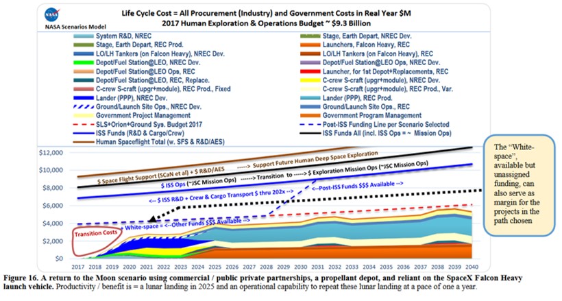 This portfolio (similarly in the NASA Science side of the house) stretches out inside budgets now bemoaned as insufficient. In the days of force-fitting spaceships into NASA budgets, we knew that overcoming limitations first meant understanding them. If you want to get out of a budget box, you must accept you are in one – long term. The increasing use of commercial public-private partnerships indirectly admits the NASA budget box exists. Our inconvenient math years ago was, at the time, a bridge too far, moving most of NASA’s space transportation into commercial services. (Otherwise, our reply to anyone asking for directions was you can’t get there from here.) But the additional commercial moves to date are likely not far enough.
