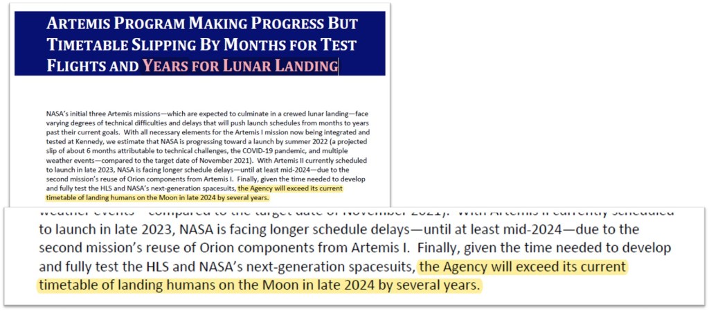 The root of this recent report lies elsewhere, back in the IG report of November 2021, receiving little fanfare at the time. Increasingly hinted at and danced around in reports stretching back years, we saw the real impertinent question. The IG concluded, “the Agency will exceed its current timetable of landing humans on the Moon in late 2024 by several years.” Alternatives are discussed, recommendations are provided. If it’s measurable, it’s good; if it’s realistic, even better.