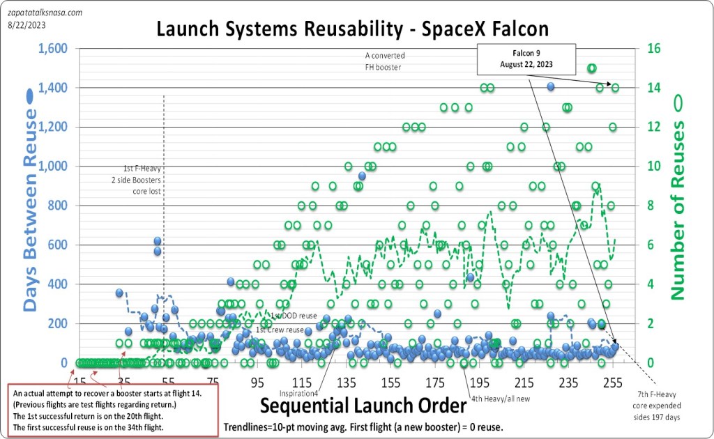 What’s more critical is buried below – the fewer and fewer boosters that have not been reused, being new, and all the launches in between. Only about ten new boosters have joined the SpaceX fleet in the last hundred launches. This is the better indicator that SpaceX reuse hovers at about ten reuses per booster. (Any trend line is adversely hit when a new booster arrives, so the back and forth between averaging six to seven reuses.)