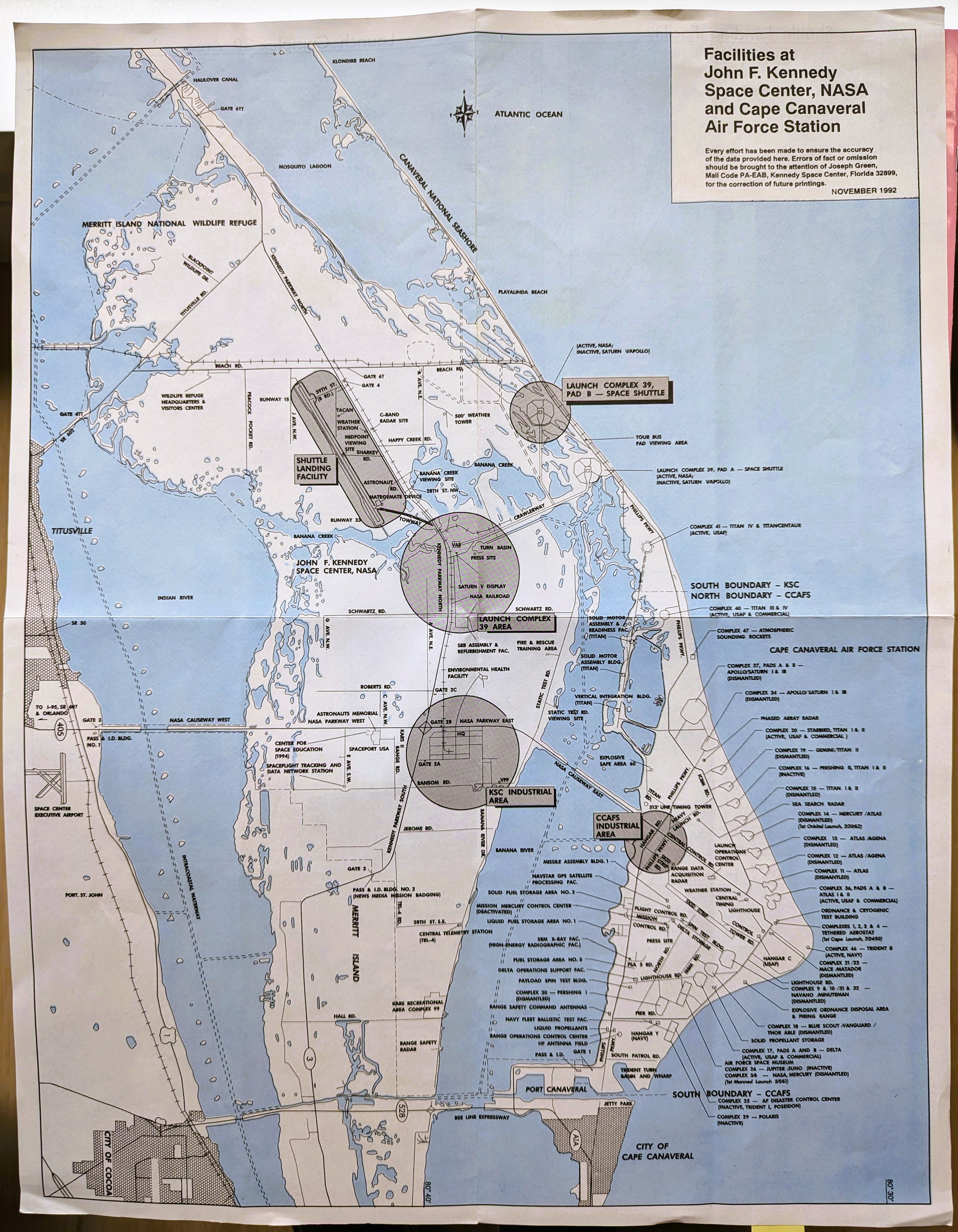 A lot has changed. This map of the Kennedy Space Center from 1992 was mainly given to employees or the occasional bunch in a pile at Family Day. Most of my copies have seen the scourge of time, dog-eared, marked with highlighters and sharpies, crossing out one launch pad rocket for another. Adding notes. So many scribbles. Yet a few days ago, while unpacking, I found a pristine copy.