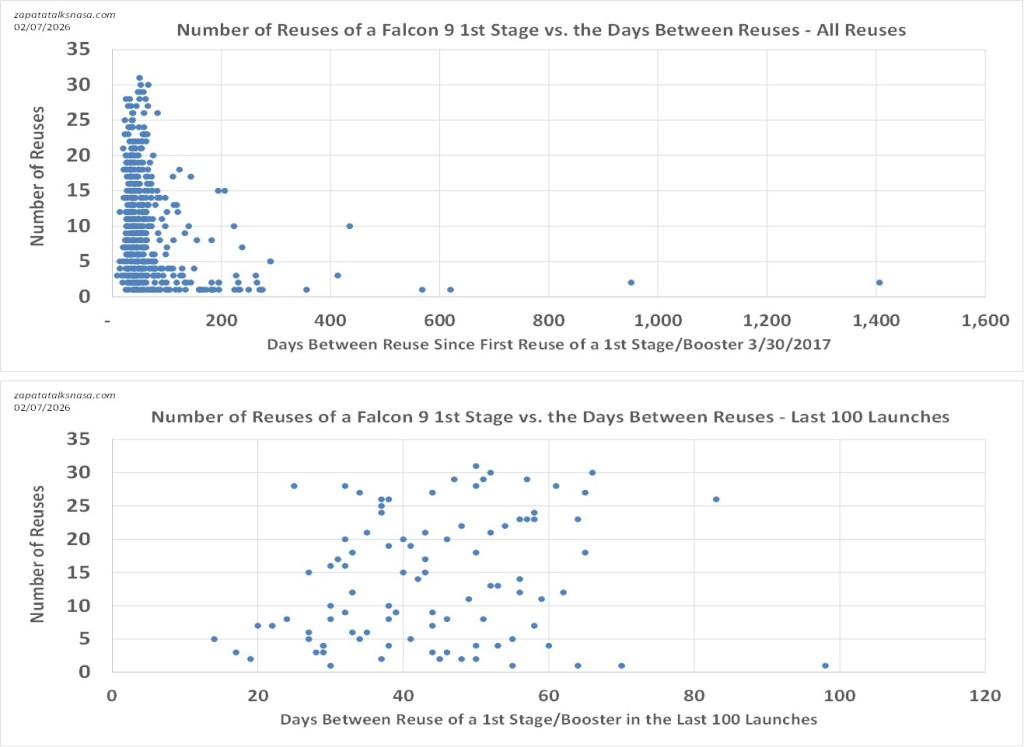 Curious minds want to know. If we look at the time it takes SpaceX to reuse a first-stage/booster, the days between one launch and a relaunch, and the number of times that booster is reused, what do we see? Surely some SpaceX employee has looked at this, too. Though I’m reminded of a time decades ago when I asked about the data for the Space Shuttles, Discovery, Atlantis, and so on, and what parts failed most often from launch to launch. It became apparent at the start that the data we wanted was not collected, at least not in a useful format that would answer the question.
