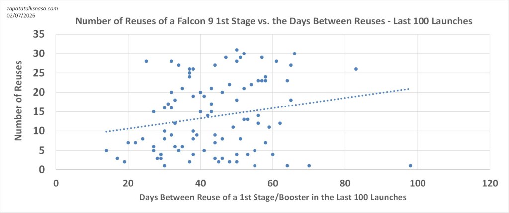 Possibly. In the last 100 Falcon launches only, the pattern of less reuse having a wider turn time mostly disappears. Mostly. Points at the bottom of the graph are still slightly more spread out than those at the top. But the obvious pattern seen looking back further mostly disappears when looking at the most recent operations. A new pattern does appear, also very slight, supporting the original notion of more reuse meaning a slightly longer turn time – the wear and tear hypothesis. Notice the ever-so-slight leaning of the points, more to the right as reuse increases (confirmed by a trendline).