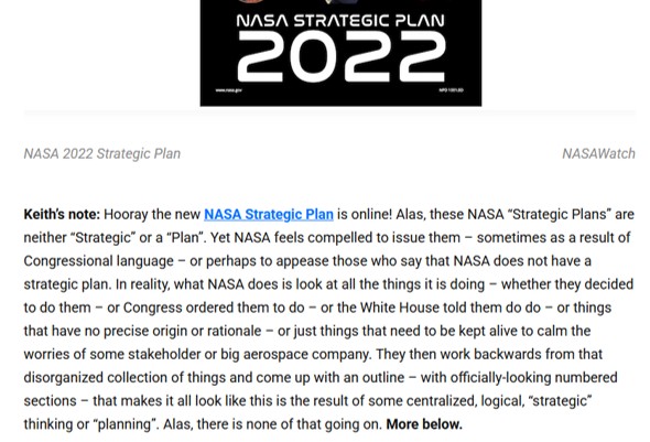 But there remains a truer cause for how NASA got where it is today. The cheering, the excitement, the sense of a turning point. If I can say so, from my years in the Shuttle program, then in too many advanced projects, too many studies, and too much cool new hardware sent to the dump. It all began by forgetting to ask “why” NASA exists. If there is to be a NASA in the future. NASA exists to embrace and create a vibrant future for humanity, where Earth remains our home but the solar system is our backyard. Project after program after shift can’t be about preserving the past, like SLS/Orion, or about desperate measures to survive, as when adjustments finally arrive on the doorstep. Congress has given NASA an inch. Now it’s time to take a yard.