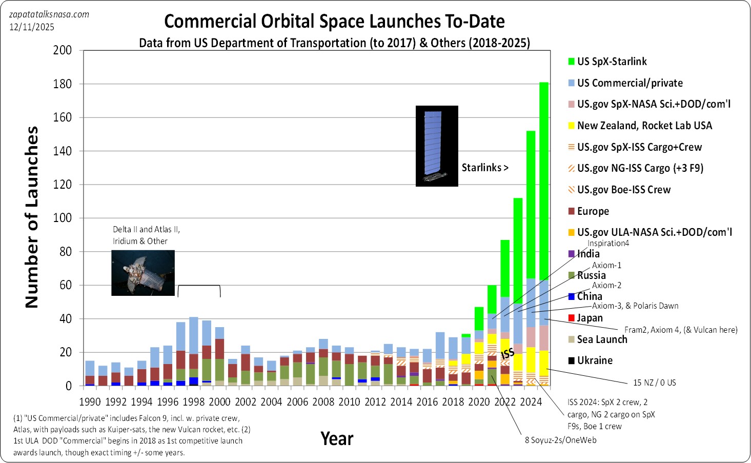 The US Department of Transportation defines a commercial launch as a“launch that is internationally competed (i.e., available in principle to international launch providers) or whose primary payload is commercial in nature”; also FAA licensed launches. So, interpreting Starlink as “commercial in nature,” it is included here. Cargo and crew to the ISS and NASA science missions are competed and awarded on commercial terms as a service and licensed by the FAA, even if only competed nationally, so they are also included here.