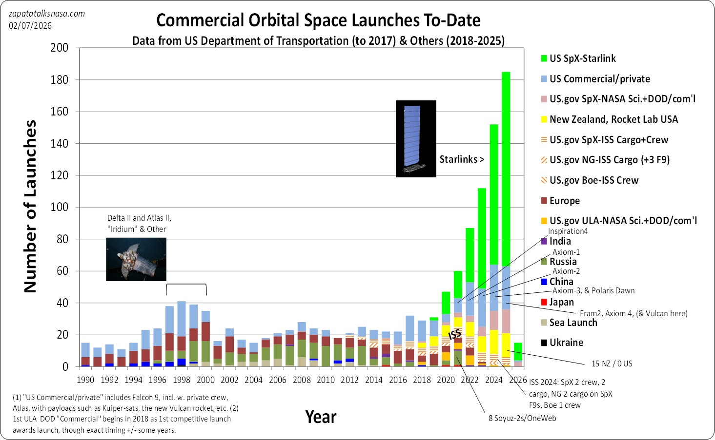The US Department of Transportation defines a commercial launch as a “launch that is internationally competed (i.e., available in principle to international launch providers) or whose primary payload is commercial in nature”; also, FAA-licensed launches. So, interpreting Starlink as “commercial in nature,” it is included here. Cargo and crew to the ISS, NASA science missions, and now US DoD payloads are also “competed” and awarded on “commercial” terms, even if only nationally, and so are included here.