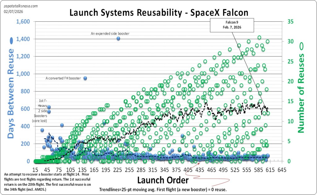 SpaceX’s booster reuse is plateauing at about 13 reuses per booster. This is a combination of new boosters coming online, pushing the trend line down with zero reuses, purposely expended boosters, and some boosters seeing much more reuse. (Upper black dashed line.)