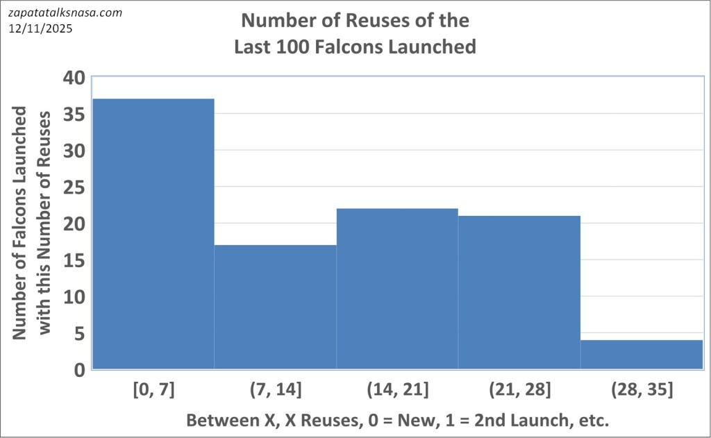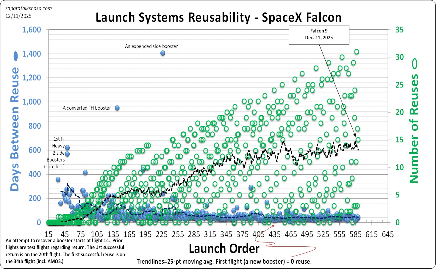 SpaceX’s booster reuse climbed steadily but is now plateauing, averaging about 13 reuses per booster. This is a combination of new boosters coming online, pushing the trend line down with zero reuses, purposely expended boosters, and some boosters seeing much more reuse.