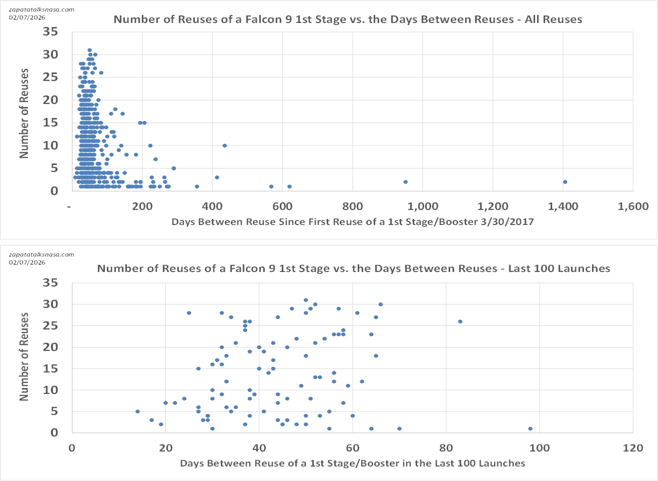 What are these graphs above saying? Curiously and counterintuitively, long-term data since the first reuse of a Falcon 9 1st stage/booster tends to a wider range of turnaround times as the booster is newer. (Would have expected the reverse, that more reuse equals more wear and tear and higher turnaround times, a wider spread of points at the top, and a shift leaning to the right.)